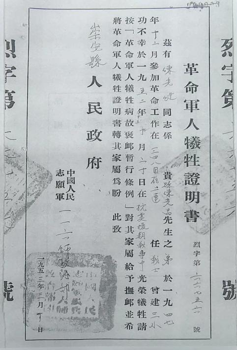 4.烈士練光健,男,福建省崇安縣新村區(qū)安文鎮(zhèn)人(按當(dāng)時記載的文字編寫),1947年12月參加革命,原中共人民志愿軍一一六師三四八團(tuán)炮二連戰(zhàn)士,榮立三小功一次,1952年10月20日在抗美援朝戰(zhàn)爭中光榮犧牲。(烈士哥哥練光昌)