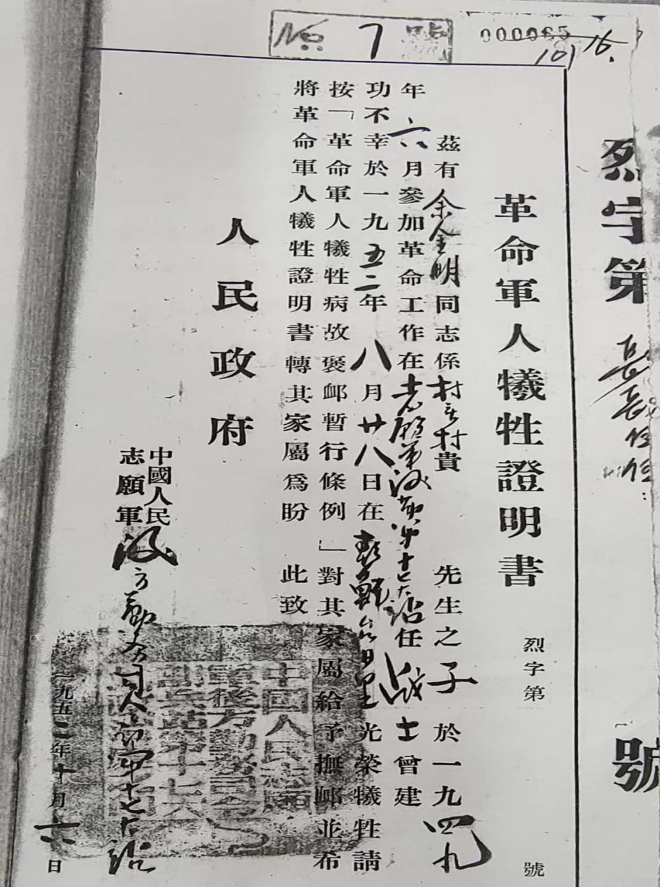1.烈士余金明,男,福建省崇安縣下梅鄉(xiāng)人,1923年出生,1949年6月參加革命,原中國人民志愿軍后方勤務(wù)司令部兵站第十七大站戰(zhàn)士,1952年8月28日在朝鮮光榮犧牲。