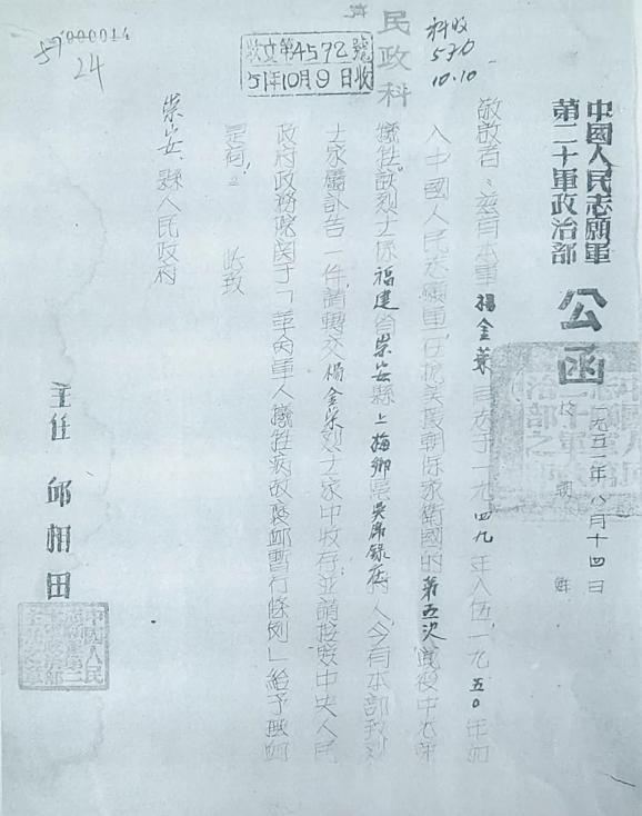 5.烈士楊金榮,福建省崇安縣上梅鄉(xiāng)吳席X莊人(按當(dāng)時記載的文字編寫),原中國人民志愿軍第二十軍戰(zhàn)士,1949年入伍,1950年參加中共人民志愿軍,在抗美援朝第五次戰(zhàn)役中光榮犧牲。