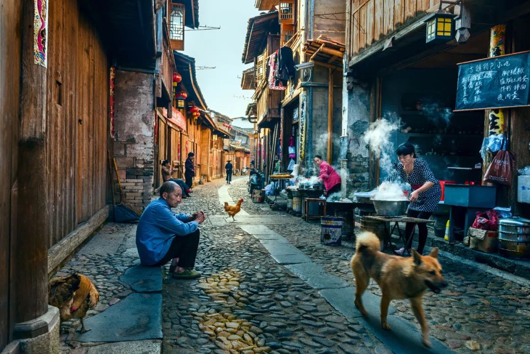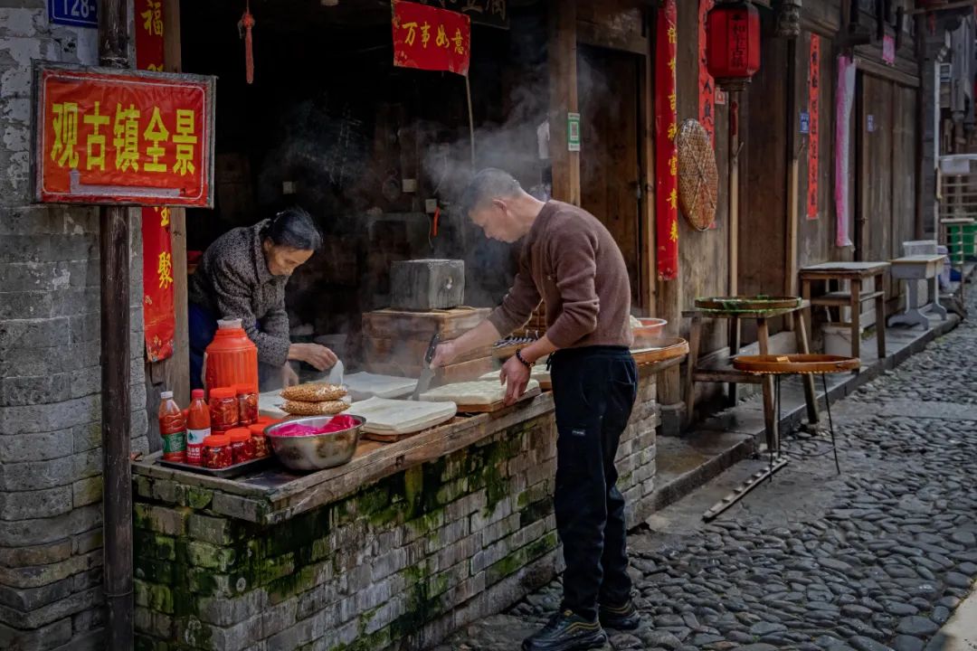 茶香、酒香、豆香、菜香,古鎮(zhèn)里令人牽腸掛肚的香味,伴著熱騰騰的霧氣,縈繞在其樂融融的氛圍里。街邊小店,一家三口周旋于店面與灶臺之間,臉上明晃晃的汗水,嘴角旁熱情的笑容,嫻熟的動作,精煉的吆喝。一時間,“家”的味道竟然如此親切醇厚,和平古鎮(zhèn)人間煙火的深情,令人心生溫暖。