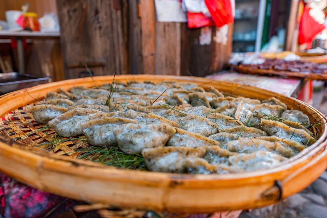 除了游漿豆腐外,和平方言所指的“哪吒醍”和“靠粘提”也不可錯過。草木蔓發(fā),春山可望時節(jié),江南的田野有一種鼠曲草,古鎮(zhèn)人們把它采來制作小吃。取粳米等磨漿,熬到半熟,再弄成幾個大圓米團,蒸熟后掰成小團,捏成薄片,包上餡像個大餃子。大米、野草、豆干、芋頭,綠色食品,滿嘴生香。