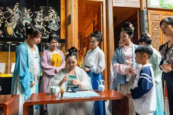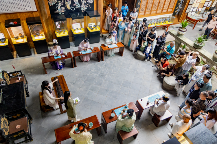 大賽吸引了大批愛茶人士,觀眾們一邊聆聽悠揚婉轉(zhuǎn)的琴音,一邊感受宋式點茶的魅力。比賽現(xiàn)場,選手們身穿宋制漢服行時揖禮,潤筅、溫盞、投茶粉、注水沖點、茶筅擊拂、茶膏畫字……動作嫻熟、姿態(tài)雅致,再現(xiàn)宋代點茶風(fēng)采,現(xiàn)場茶香四溢。