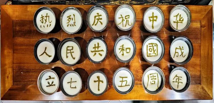 比賽分三組,經(jīng)過近二個小時的比賽,評委根據(jù)茶藝師的表演美感、沫餑色澤、細膩度、持久度、厚度和在茶面上書寫水平,評選出優(yōu)秀獎、入圍獎各9名。茶藝師還在白色的茶面上寫出“熱烈慶祝中華人民共和國成立七十五周年”十八個特別意義的文字。