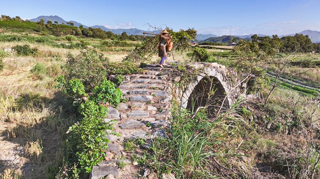 記者近日隨松溪縣文物普查隊(duì)來到松溪縣茶平鄉(xiāng)林下村旁一個(gè)山丘上,遠(yuǎn)遠(yuǎn)便望見一座古橋橫跨其間,將茶園和稻田連接,似長虹臥波,隨地形起伏蜿蜒,自然古樸、安穩(wěn)寧靜。古橋與周圍田野和遠(yuǎn)處山色互相映襯,構(gòu)成一幅和諧自然的風(fēng)景圖。
