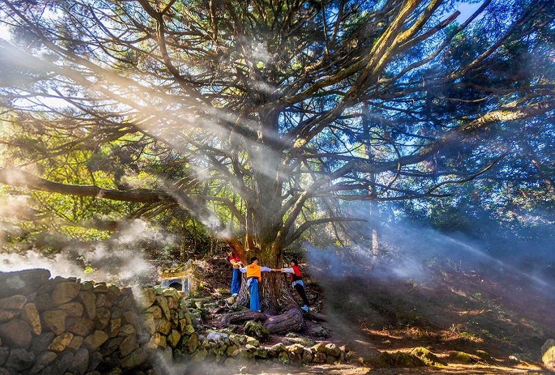 過(guò)橋往右向水岸走十多米卵石路,仰頭就見(jiàn)到了一棵高達(dá)二十多米,枝葉蒼虬,傲然佇立在藍(lán)天下的“杉木王”。此棵兩人合抱不過(guò)的老杉生長(zhǎng)在龜形巨石之上,主干從底部往上數(shù)米分為三杈并列至頂,極其罕見(jiàn)。同行者小宋說(shuō),傳說(shuō)古杉為舊時(shí)當(dāng)?shù)匾桓咧袪钤那嗄陮W(xué)子神幻所化。古杉樹(shù)齡1100余年。我們看到“杉木王”樹(shù)底下的“狀元亭”神案里供奉著狀元的神像,案前擺滿水果等供品,積滿香灰的香爐還有未燃盡的裊裊香火。
