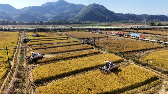 11月7日,政鑫山農(nóng)機(jī)專業(yè)合作社農(nóng)機(jī)手駕駛新買的農(nóng)機(jī)參加水稻機(jī)收比武活動(dòng)