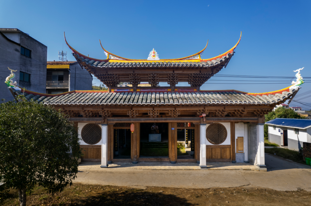 在村口一叢三角梅的迎接下,我們拐入陽澤村一片傳統(tǒng)古村落,這里坐落著江公祠。沿著祠堂巷往村落深處探訪,會發(fā)現(xiàn)這里許多房屋沿著一灣河水修建。沿河路段,部分住房的門前或用一塊木板,或用一條石板從門前延伸,跨過河面,抵達(dá)對岸。