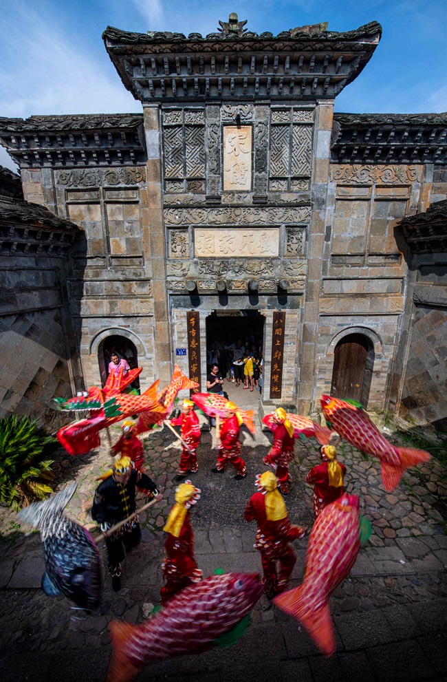 書院一側(cè)墻上刻有龍魚浮雕。龍頭魚身的龍,寓意學(xué)子一心向?qū)W,便可化魚成龍。如今,小鎮(zhèn)還保留著一項省級非物質(zhì)文化遺產(chǎn)——五夫龍魚戲。每逢年節(jié),村民都會在古街上舞動“龍魚戲”,孩童競相追逐,十分熱鬧。