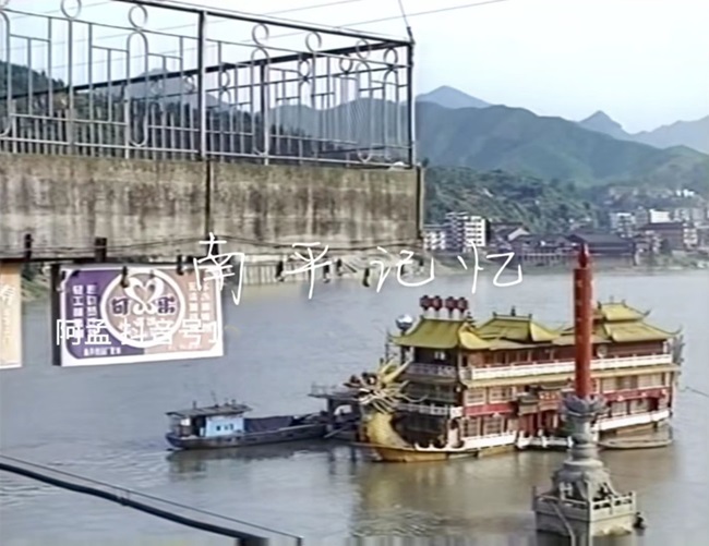 影像中,近岸是如火如荼的庫(kù)區(qū)改造工程,工地上一派繁忙景象,工人們揮汗如雨,機(jī)器轟鳴,與閩江清澈的江面形成鮮明對(duì)比。九峰酒家的“龍船”靜靜地停泊在岸邊,這艘船曾是許多延平市民舉行婚宴的熱門(mén)場(chǎng)所,也是當(dāng)時(shí)市民游客“打卡”九峰索橋時(shí)必不可少的拍照背景。鏡頭望向遠(yuǎn)處,玉屏山青翠欲滴,河岸邊一座座虛腳樓傍水而建,構(gòu)成一道獨(dú)特的風(fēng)景線(xiàn),玉屏山片區(qū)的標(biāo)志性建筑——交通大樓格外醒目,高聳的身影在當(dāng)時(shí)儼然是城市現(xiàn)代化的象征。