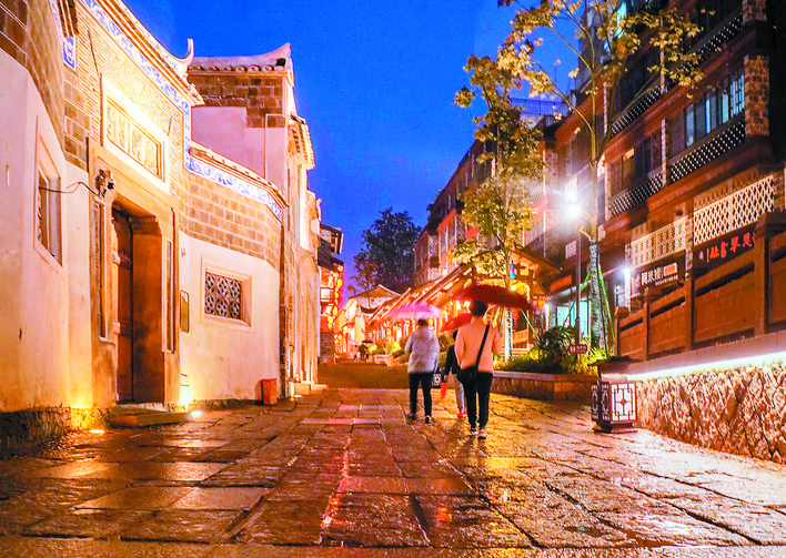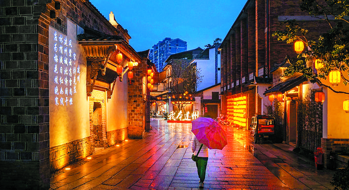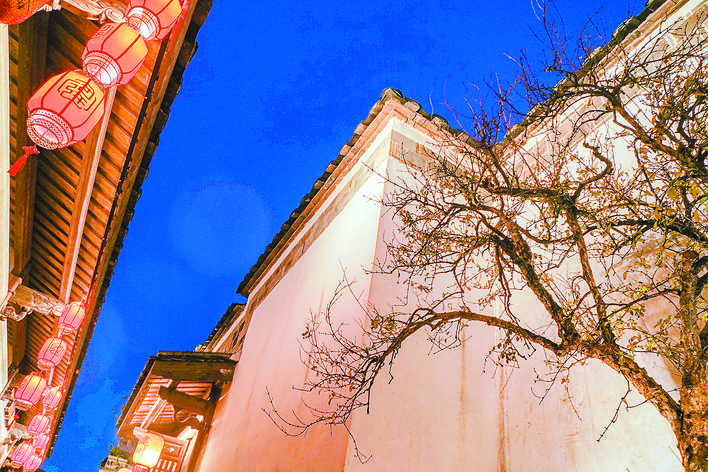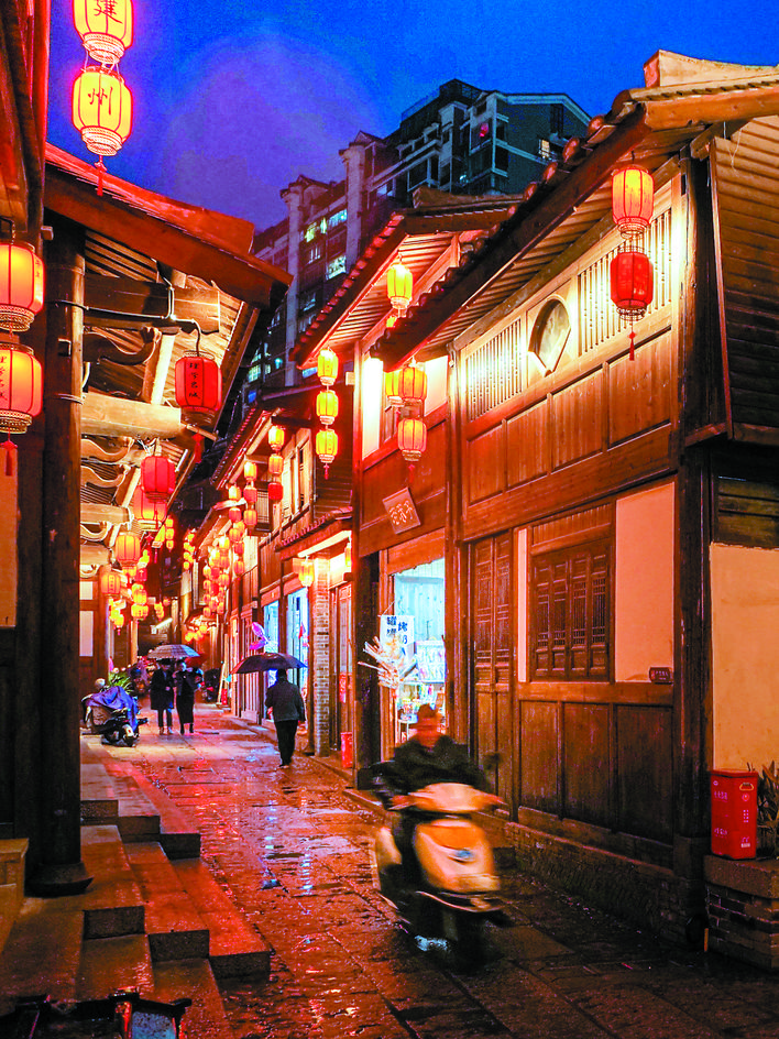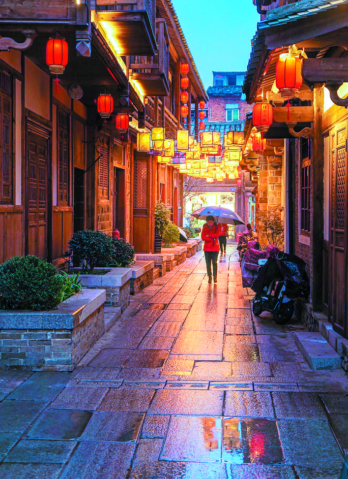 靛藍(lán)的夜幕下,我漫步在熟悉的街巷中,感受著這里久違且親切的一切。沿街挨家挨戶(hù)門(mén)前紅燈籠高掛,光影斑駁,映照著新建的亭廊樓閣,也給寂靜寒涼的冬夜增添了一份暖意。雖然雨夜凄冷行人影稀,但并不落寞寂靜。新修復(fù)的民居用閩北常見(jiàn)的青磚、黑瓦、白灰及木雕裝飾,飛檐翹角處,紅布飄飄,與寫(xiě)滿(mǎn)“福”字或“理學(xué)名城”“建州”“茶旅”等字樣的各式各色燈籠遙相呼應(yīng)。店鋪的燈亮著,透過(guò)門(mén)窗投射出柔和的光線,照在濕漉漉的青石板路面上,泛著亮光;不時(shí)有電視的聲響與短視頻的音樂(lè)從門(mén)前溢出,和著熟悉的方言,從樓上淌下,往身邊飄過(guò)。我閉上眼睛,深深呼吸,空氣中似乎彌漫著板鴨的香味,仿佛還有豆?jié){粉的香味,油條的香味。我暗自笑了,知道這是古巷的味道,是歲月的氣息,這里的煙火味依舊濃重,曾經(jīng)有過(guò)的隱約擔(dān)心早已釋然。