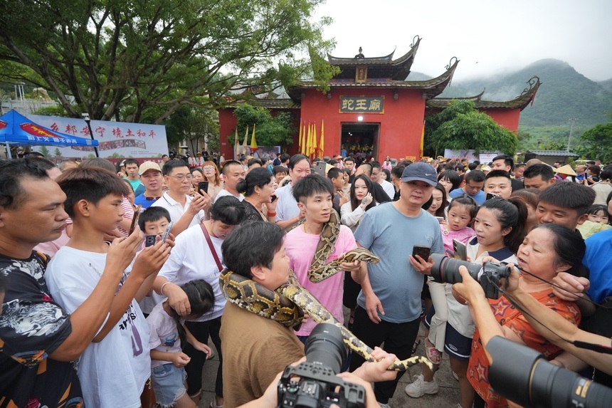2023年樟湖崇蛇文化旅游節(jié)現(xiàn)場,上演現(xiàn)實版“人蛇共舞”的別樣狂歡節(jié)。圖為蛇王廟前,群眾游客與蛇親密接觸。(資料圖片)