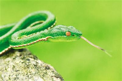 一只在武夷山國家公園生物資源本底調(diào)查時發(fā)現(xiàn)的福建竹葉青蛇停留在巖石上。 (資料圖片)