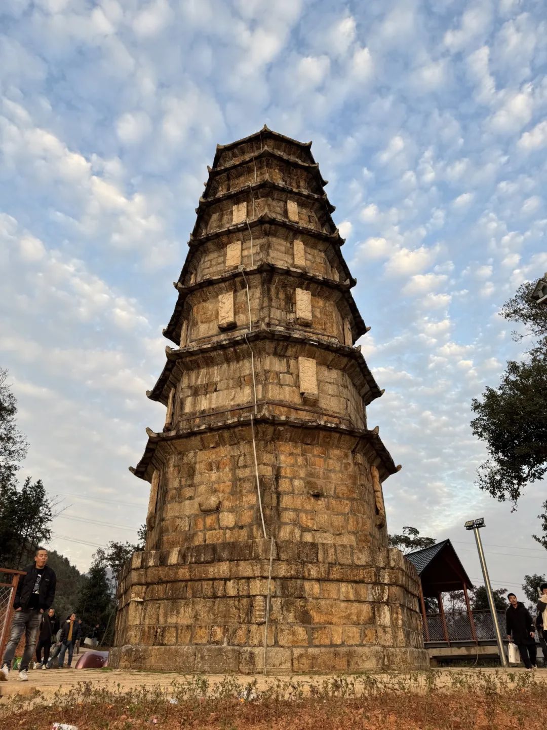 多寶塔位于建陽(yáng)鯉魚山,是一座八角玲瓏的七層塔,大石板砌就的穩(wěn)固塔基上,有8尊石獅守護(hù)八方。用方磚砌成的塔身,每層塔用檐木條烘托著挑出的石條。整座塔由條石、方磚、木條構(gòu)成,從上到下渾然一體,顯得古樸、雅致。