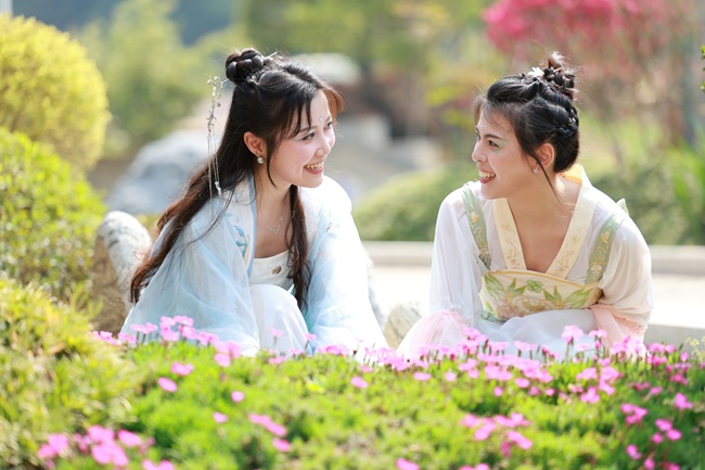身著漢服的“花仙子”們?cè)诨êV邢嘁暥?/span>