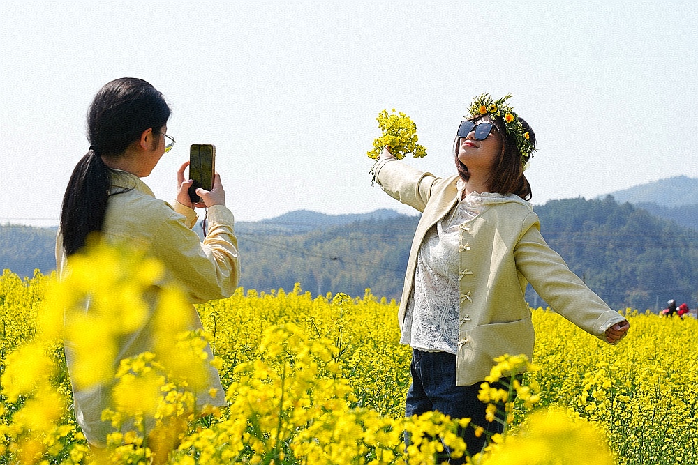 游客在油菜花海中拍照留念 (肖和勇 陳子昕 攝)
