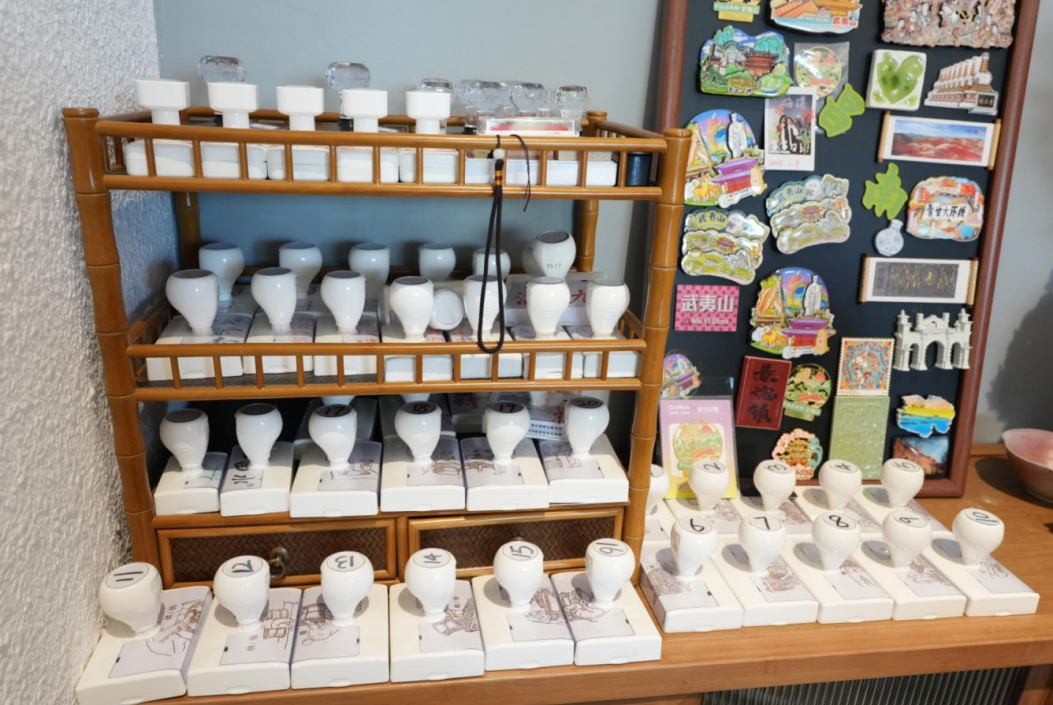 記者在走訪中發(fā)現(xiàn),在武夷山不光是景點(diǎn),就連文創(chuàng)店、奶茶店、酒店,甚至是茶葉店都提供了蓋章打卡的服務(wù),也出現(xiàn)不少特色紀(jì)念章。