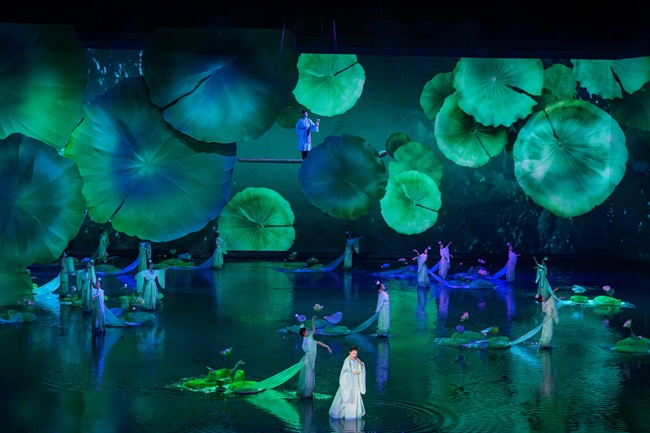 當(dāng)舞臺(tái)上的水元素與光影相互配合,雨水、溪水、酒水、茶水、淚水交織,象征著思想的匯聚與碰撞。