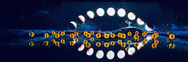 這是一出別具沉浸感的演出,在《月映武夷》可以沉浸式體驗(yàn)“黑科技”集群?!拔覀兲匾庠鰪?qiáng)了沉浸感的設(shè)計(jì)。”馮巖說(shuō),“在結(jié)構(gòu)和空間上,采用留黑形式控制多媒體節(jié)奏,避免視覺(jué)疲勞;通過(guò)月相、影像與水反光結(jié)合等方式,將抽象概念具象化;在270度全景式舞臺(tái)設(shè)計(jì)中,克服三面屏技術(shù)難點(diǎn),利用裸眼3D和空間模擬減小視覺(jué)差,兼顧不同角度觀眾的觀看感受。”