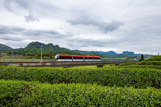 武夷有軌電車穿過(guò)春日里的青青茶園