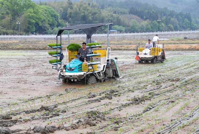 9日,在武夷山市五夫鎮(zhèn)武夷山稻香生態(tài)農(nóng)業(yè)科技發(fā)展有限公司高標(biāo)準(zhǔn)農(nóng)田,農(nóng)民駕駛插秧機(jī)進(jìn)行再生稻插秧作業(yè)。武夷山今年種植再生稻5000多畝,已進(jìn)入插秧期,當(dāng)?shù)負(fù)屪マr(nóng)時(shí),利用新型農(nóng)機(jī)具進(jìn)行再生稻種植。 (邱汝泉 攝)