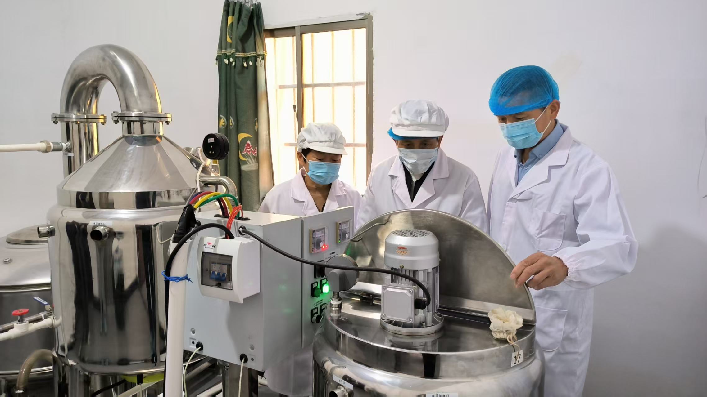 王榮玉與合作社員在察看蜂蜜加工生產(chǎn)情況。