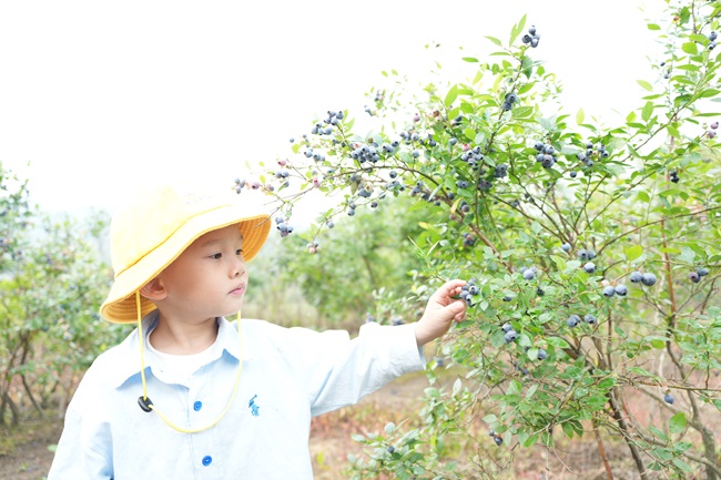 “媽媽快看!這顆藍(lán)莓比我的拇指還大呢!”5歲的陳子言興奮地舉著剛摘下的藍(lán)莓,眼睛笑得瞇成了一條縫。在藍(lán)莓叢間,三三兩兩的游客提著小籃子,精心挑選著又大又飽滿的藍(lán)莓果實(shí),還不時(shí)往嘴里塞兩顆,酸甜的汁水在舌尖瞬間爆開(kāi)。田埂上,清脆的笑聲與濃郁的果香相互交織,在園子里久久回蕩。