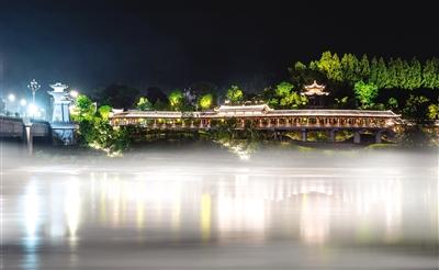 夜幕降臨,漫游道臨安壩公園段的仿古木長廊次第亮起暖黃色燈帶,與粼粼溪水共同勾勒出武夷山城區(qū)的詩意輪廓。