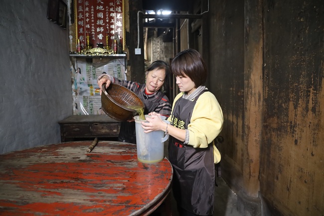 李靜(右)在制作擂茶