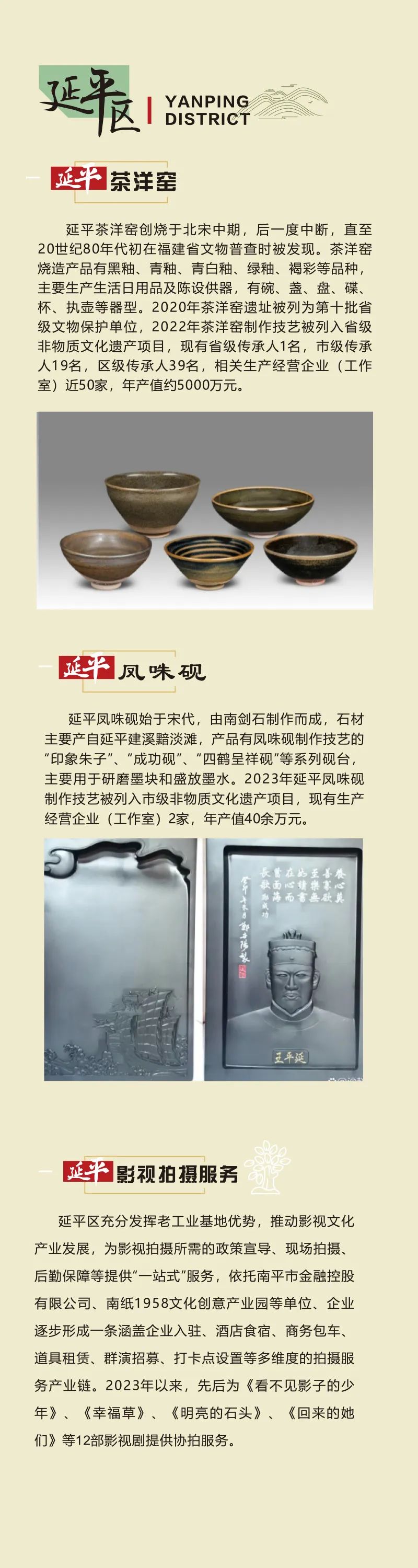 延平區(qū)的茶洋窯,千年窯火余溫仍在,仿佛能聽(tīng)見(jiàn)古窯工與窯火的對(duì)話(huà);“文房瑰寶”鳳咮硯石紋里,藏著歷代文人的筆墨情;老工業(yè)基地的影視拍攝現(xiàn)場(chǎng),正上演歷史與現(xiàn)代的碰撞。
