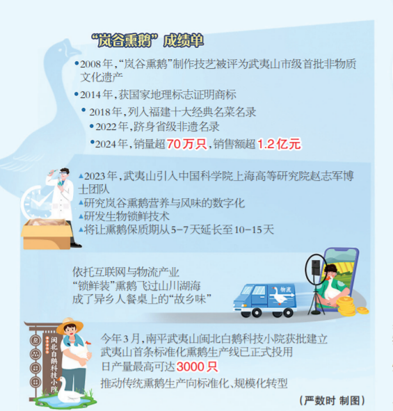 2024年,武夷山市熏鵝銷量超70萬只,銷售額沖破1.2億元,老手藝熬出了新滋味。