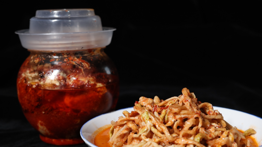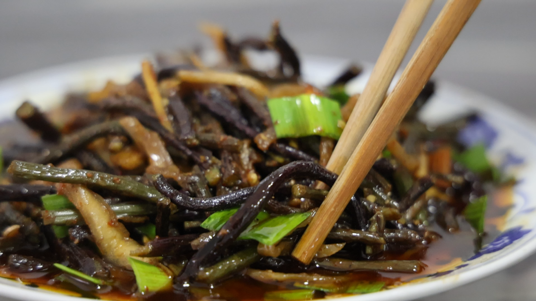 在光澤華橋鄉(xiāng),家家戶戶制作霉豆腐泡蘿卜干:選新鮮蘿卜洗凈切片,晾曬至干,再用特制霉豆腐汁浸泡。霉豆腐泡蘿卜干、“鬼子姜”、炒霉豆腐、豆渣餅、霉豆腐炒蕨菜、炒田螺、炒茄子、炒筍……作為傳統(tǒng)美食,光澤霉豆腐可作配粥小菜,可用米酒浸泡成咸菜湯汁,還能與其他食材搭配成多種菜肴。