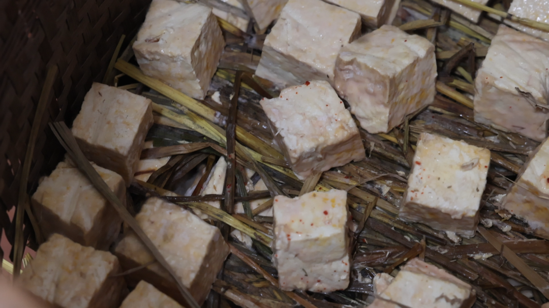 制作第一步是準(zhǔn)備本地豆腐,切成均勻正方形小塊,瀝干水分后擺在鋪新鮮稻草的竹匾里,豆腐塊間保持間距以充分接觸空氣,利于均勻發(fā)酵。