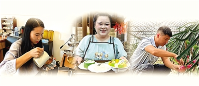 梁香玲端出剛出爐的甜品 徐志玲給顧客沖泡咖啡 田榮在大棚里采摘火龍果