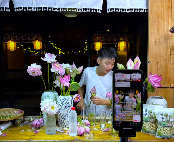 劉旭春直播賣荷花(林李冰 鐘倩 攝)【點(diǎn)擊查看詳情:從高薪白領(lǐng)到荷塘主播,26 歲小伙帶火五夫荷花,50萬(wàn)粉絲追著這抹香】