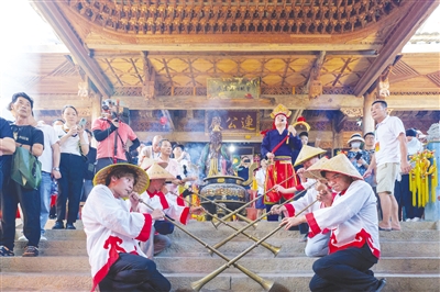 村民吹起嗩吶,迎候蛇神神像進(jìn)入蛇王廟。