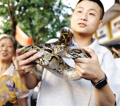 游客與蛇互動。