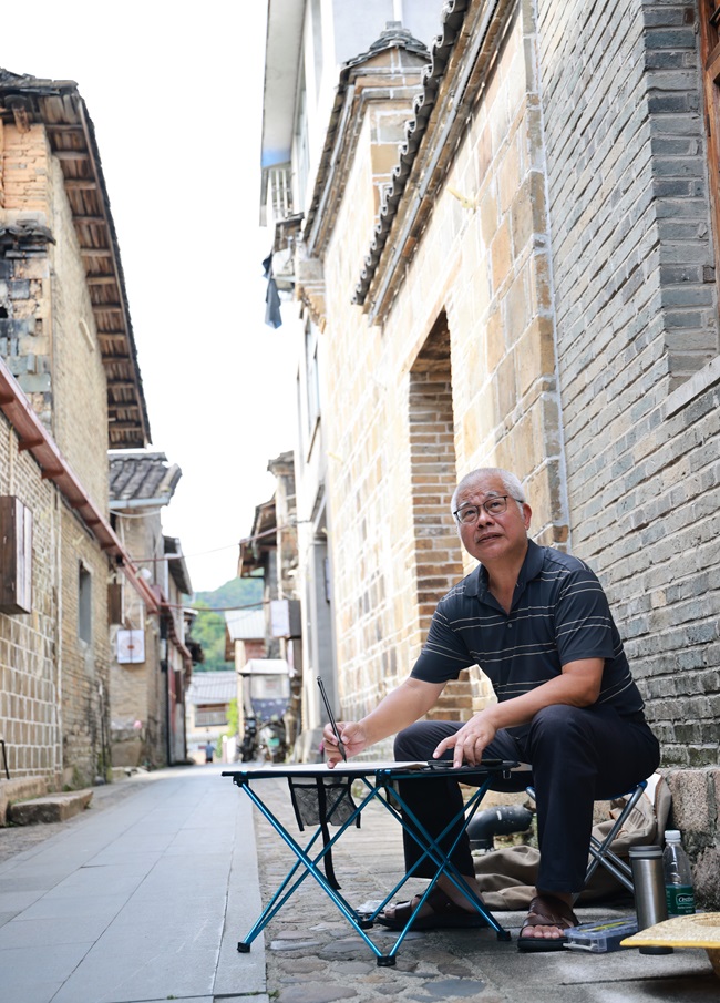 20日,由福建省文旅廳、福建省鄉(xiāng)村振興研究會(huì)、順昌縣委縣政府等聯(lián)合主辦的“藝術(shù)點(diǎn)亮鄉(xiāng)村”活動(dòng)在元坑鎮(zhèn)謨武村拉開帷幕。參加活動(dòng)的書法家和畫家以書言志,以畫傳情,為鄉(xiāng)村注入藝術(shù)活力。圖為畫家在謨武文苑旁作畫,展現(xiàn)古建筑之美。 (廖敏愷 雷斌凌 攝)