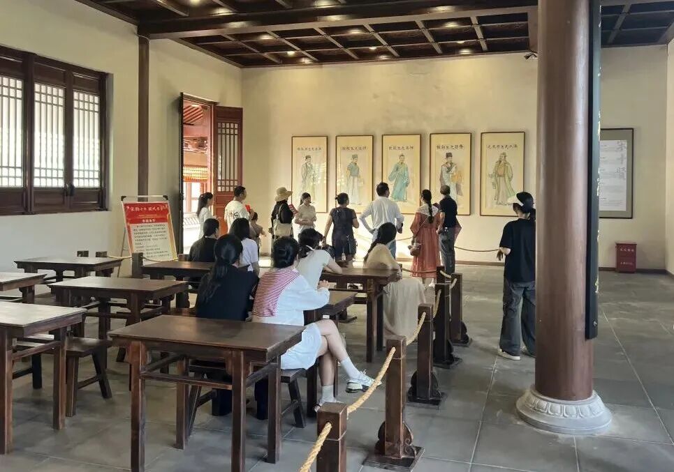 而九曲溪畔的武夷精舍,則是另一處讓游客“慢下來”的深度體驗地——這里是朱子親手建的講學之所,《四書章句集注》就誕生于此。園內仁智堂、隱求室、晚對亭依山水錯落,木構匾額上的墨痕仍透著宋元學風,當年“武夷之巨觀”的盛景,如今借由沉浸式體驗重現(xiàn):游客換上宋制漢服,手持線裝《四書》選本,在庭院中齊聲誦讀“武夷山上有仙靈,山下寒流曲曲清”,瑯瑯書聲與溪澗流水交織。