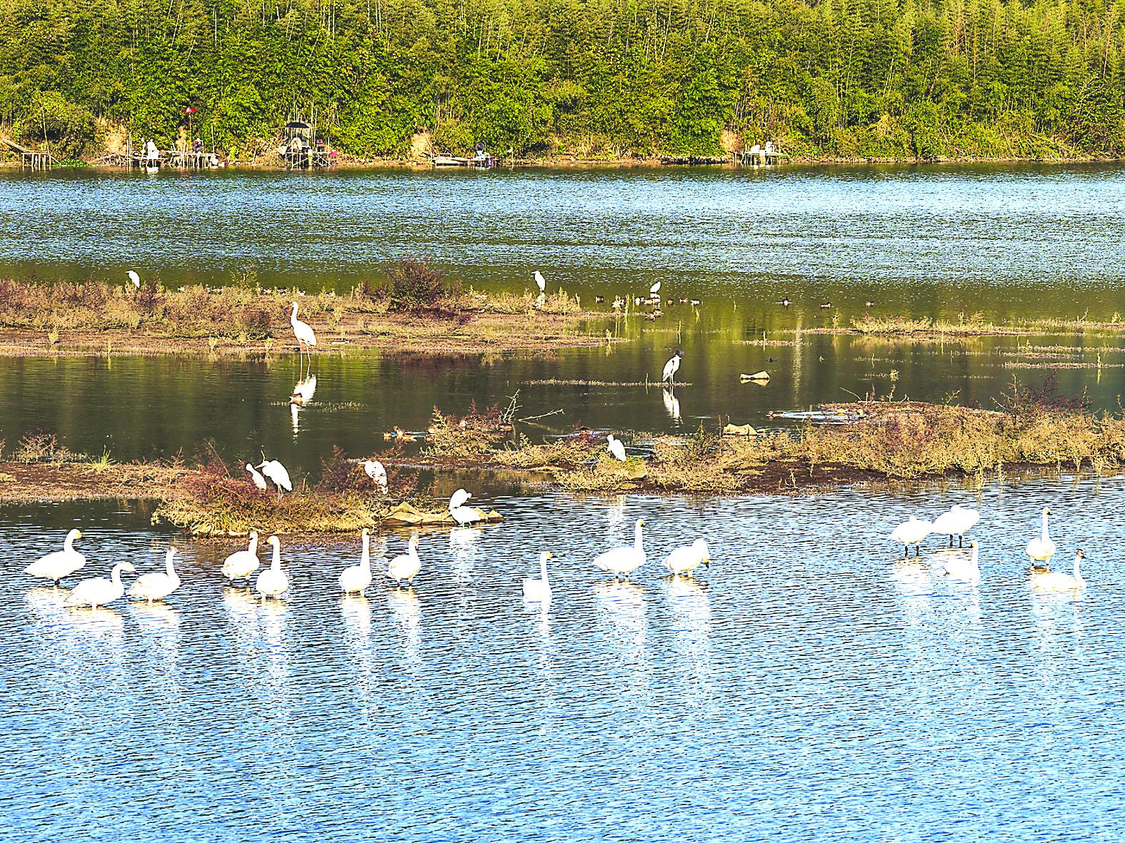19日,野生小天鵝飛抵崇陽溪建陽段“補給站”。(丁健偉 攝)
