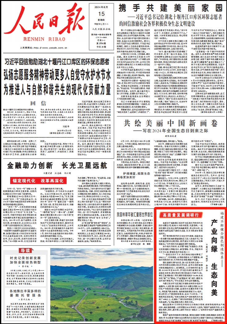 8月15日,正值2024年全國生態(tài)日到來之際,《人民日報(bào)》頭版“高質(zhì)量發(fā)展調(diào)研行”刊發(fā)通訊《產(chǎn)業(yè)向綠 生態(tài)向美》,點(diǎn)贊福建省堅(jiān)持生態(tài)環(huán)境“高顏值”和經(jīng)濟(jì)發(fā)展“高素質(zhì)”協(xié)同并進(jìn),通過政策引導(dǎo)、標(biāo)桿帶動(dòng)、示范推廣、優(yōu)化生態(tài)等舉措,深入推進(jìn)工業(yè)數(shù)字化轉(zhuǎn)型,全面推動(dòng)制造業(yè)綠色發(fā)展。