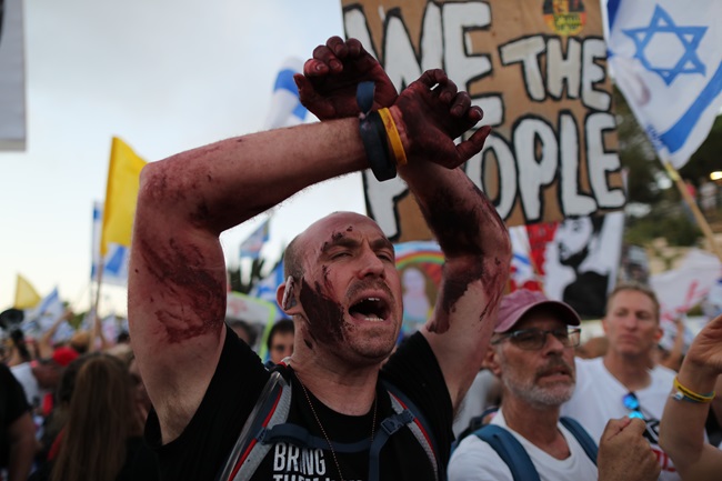 2024年7月13日,民眾在耶路撒冷舉行集會(huì),要求以色列政府在加沙地帶?;鹬箲?zhàn)。 (新華社發(fā) 賈馬爾·阿瓦德 攝)