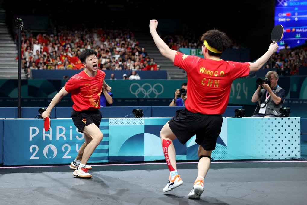 2024年8月9日,中國隊組合馬龍(左)/王楚欽慶祝勝利。當(dāng)日,在巴黎奧運會乒乓球男團金牌賽中,中國隊戰(zhàn)勝瑞典隊,獲得冠軍。新華社記者 劉續(xù) 攝