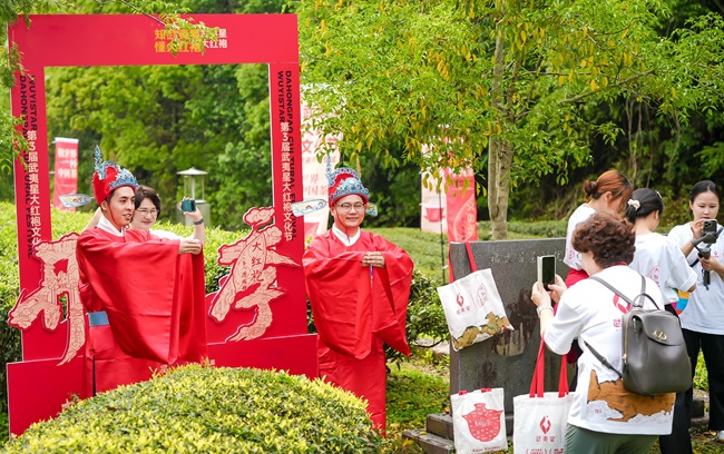 20日,谷雨節(jié)氣,“第三屆武夷星大紅袍文化節(jié)暨2025春茶開山儀式”在武夷山御茶園舉辦。2023年,武夷星茶業(yè)有限公司成功打造“大紅袍文化節(jié)”,用豐富的茶主題系列活動,向全世界展現(xiàn)多姿多彩的中國傳統(tǒng)文化魅力。圖為游客在御茶園打卡,與身著紅袍服裝的“大紅袍狀元”合影留念。 (張筱惜 攝)