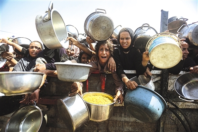 八月十日,在加沙城,民眾領(lǐng)取免費(fèi)食物。 (新華社發(fā) 里澤克·阿卜杜勒賈瓦德 攝)