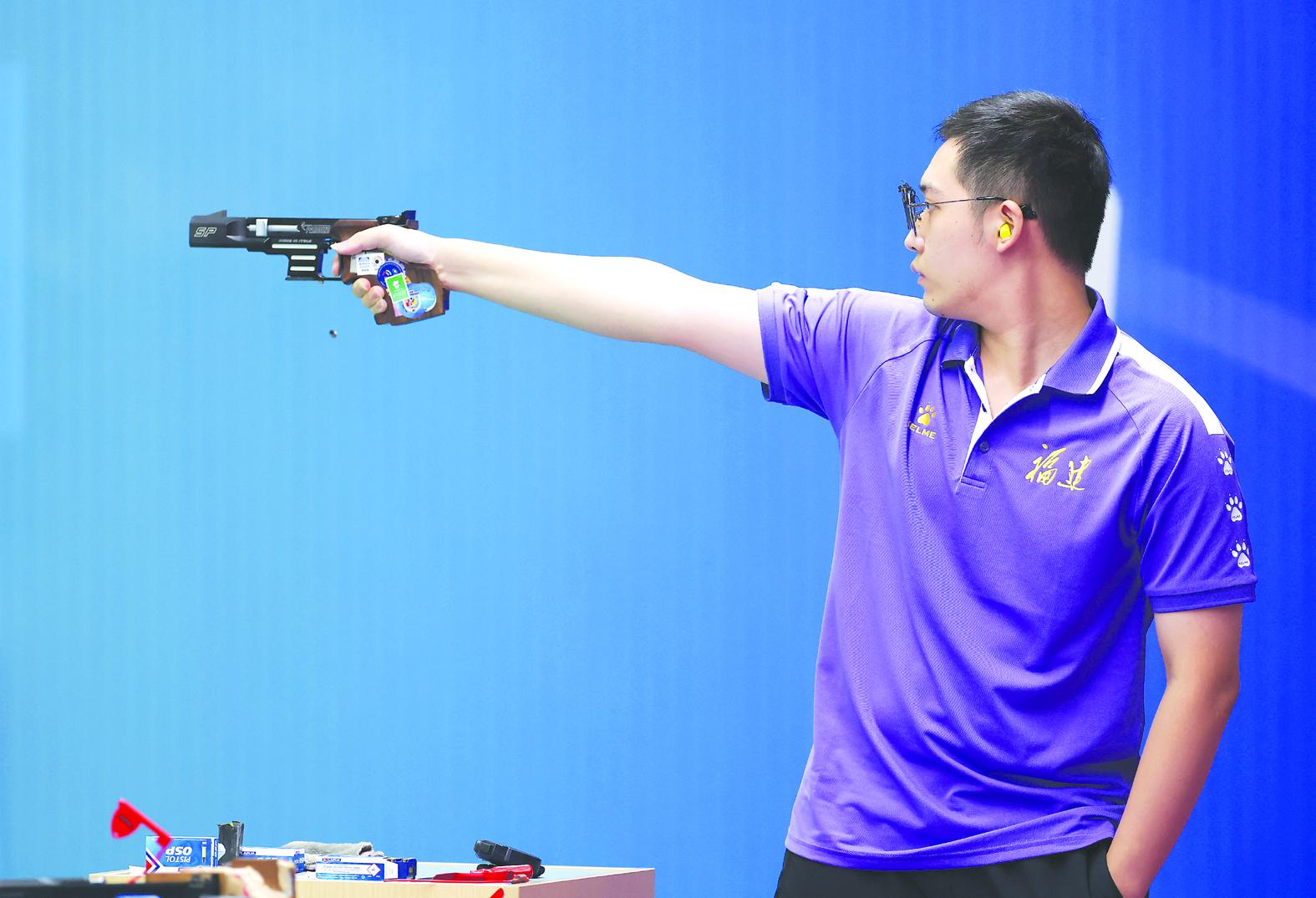 10月13日,福建隊選手蘇連博凡在比賽中。他最終獲得冠軍。當日,第十五屆全國運動會射擊男子25米手槍速射決賽在廣州舉行。 (新華社記者 盧漢欣 攝)