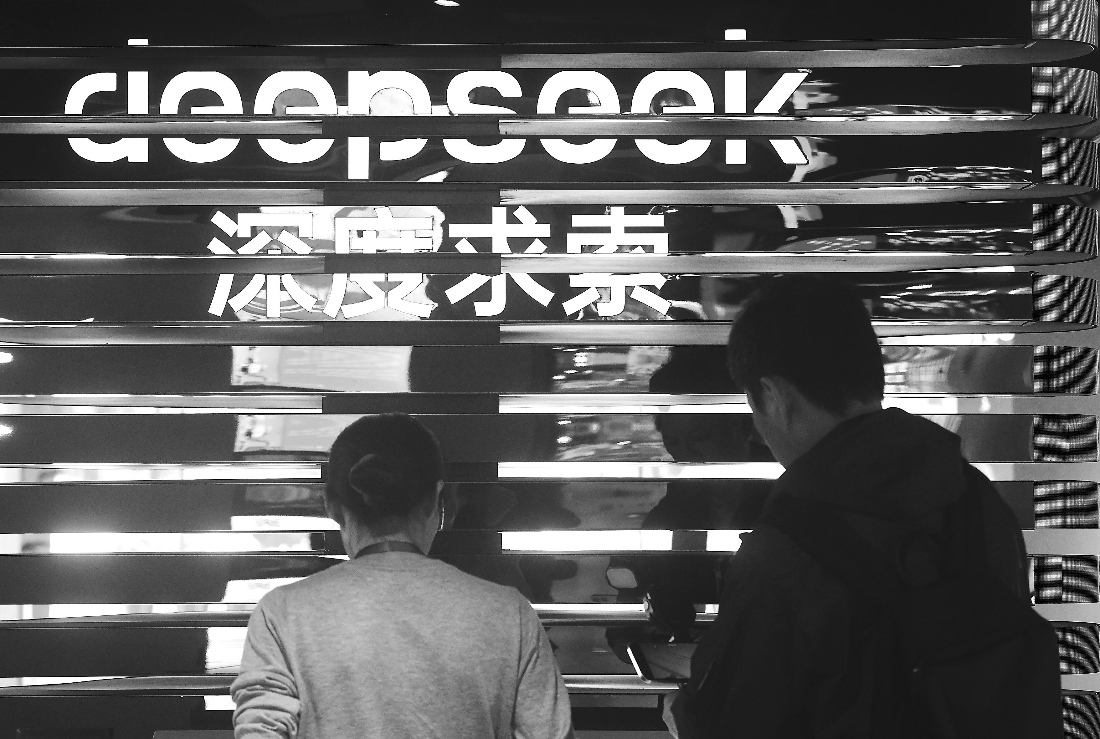 5月4日,人們在浙江省杭州市文三數(shù)字生活街區(qū)的AI黑科技市集上體驗DeepSeek的人工智能大模型。(新華社發(fā)龍巍 攝)