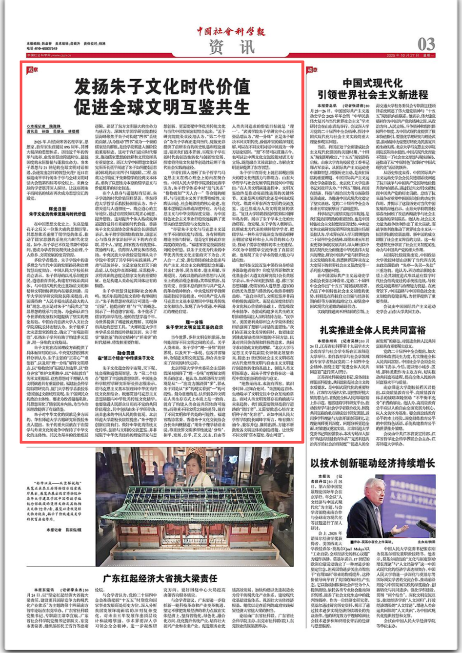 多位學(xué)者提出,朱子學(xué)說中的諸多理念與當(dāng)代中國的發(fā)展路徑和治理智慧高度契合。中國人民大學(xué)校長林尚立表示,朱子倡導(dǎo)的以禮樂制度教民、道德教育養(yǎng)民,構(gòu)建有序政治共同體,與中國式現(xiàn)代化注重物質(zhì)文明和精神文明相協(xié)調(diào)的內(nèi)在要求相通。清華大學(xué)國學(xué)研究院院長陳來提出,我國秉持的“人民幸福生活是最大的人權(quán)”理念,也正是對朱子“與民共之”發(fā)展思想的繼承與發(fā)揚,為全面認(rèn)識當(dāng)今世界的發(fā)展權(quán)問題提供了堅實的理論基礎(chǔ)。中國臺灣慈濟大學(xué)人文社會學(xué)院原院長林安梧認(rèn)為,朱子繼承了北宋思想家的理念,確立了“客觀法則性”,弘揚朱子學(xué)問有助于構(gòu)建多元互濟、理一分殊的文化格局。