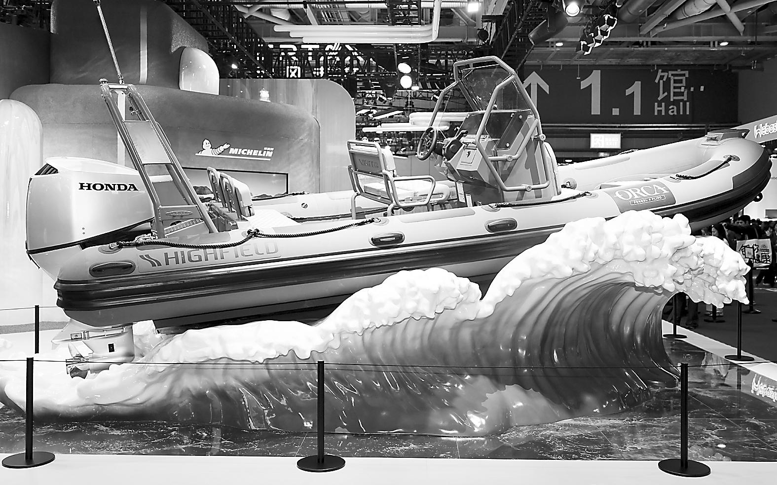 11月8日在第八屆進博會汽車及智慧出行展區(qū)米其林展位拍攝的使用復(fù)合涂層材料的剛性充氣艇。(新華社記者 王翔 攝)