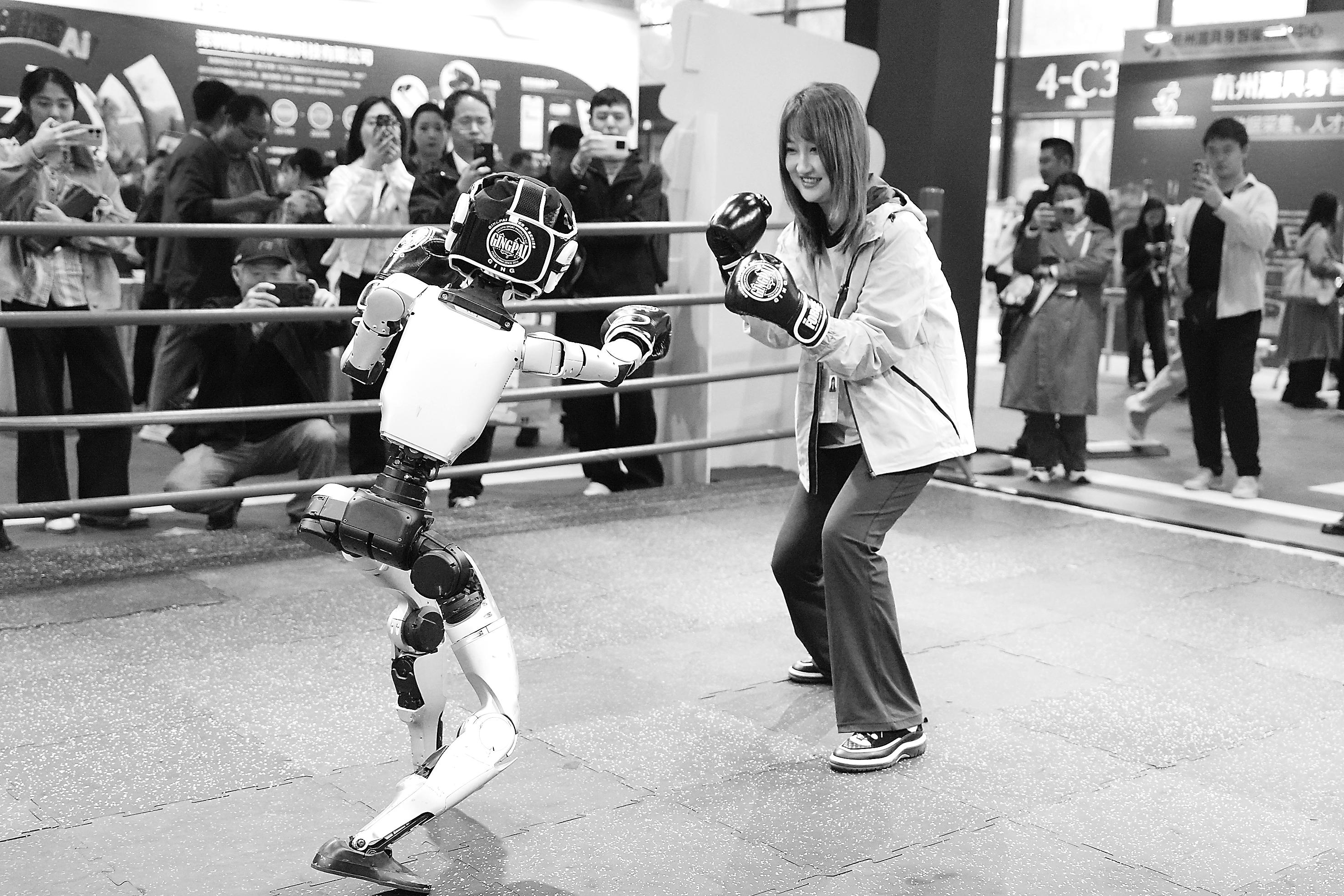 11月6日,觀眾在2025年世界互聯(lián)網(wǎng)大會(huì)“互聯(lián)網(wǎng)之光”博覽會(huì)現(xiàn)場(chǎng)體驗(yàn)與宇樹科技G1機(jī)器人“格斗”。(新華社記者 黃宗治 攝)