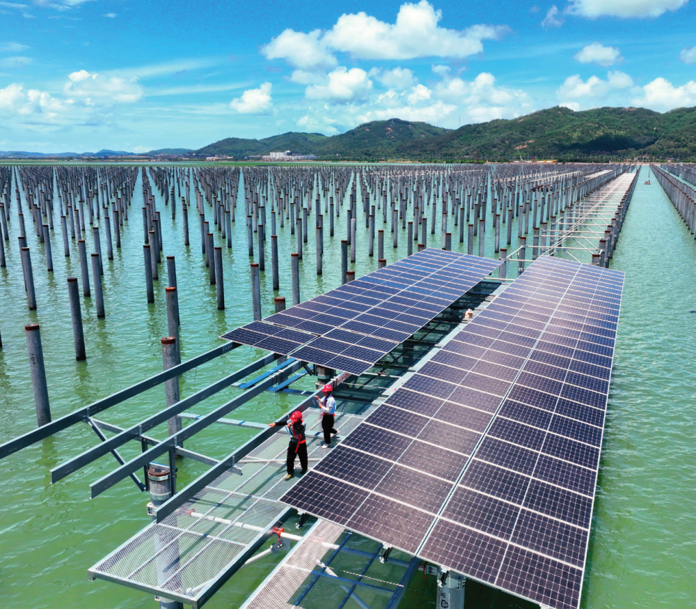 施工人員在位于福建省東山縣杏陳鎮(zhèn)、前樓鎮(zhèn)海域的海上光伏電站現(xiàn)場安裝支架和光伏組件林善傳攝 / 本刊